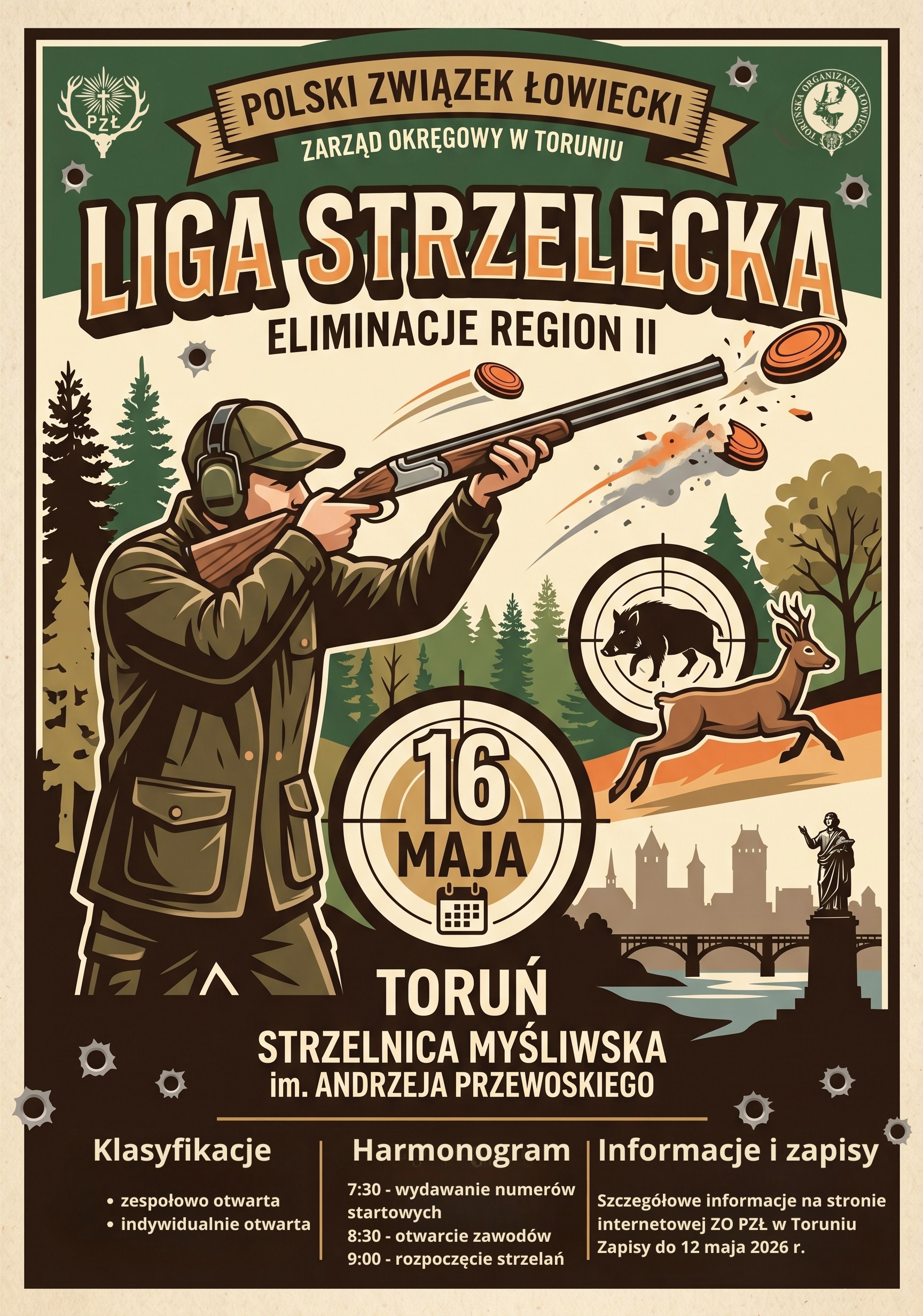 Pięciobój | 250 zł/os. | 12 maj 2026 r. | https://torun.pzlow.pl/liga-strzelecka-eliminacje-region-ii-2/ |