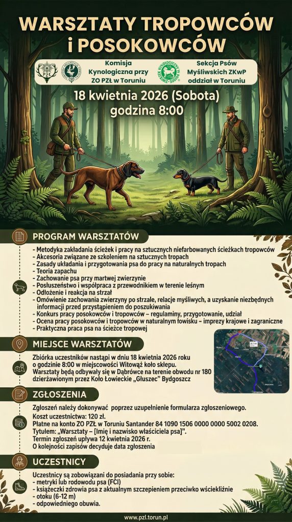 Komisja Kynologiczna przy Zarządzie Okręgowym Polskiego Związku Łowieckiego w Toruniu oraz Sekcja Psów Myśliwskich ZKwP oddział w Toruniu informuje o organizacji „Warsztatów Tropowców i Posokowców” dnia 18 kwietnia 2026 roku o godzinie 8:00 w miejscowości Dąbrówka gm. Czernikowo.