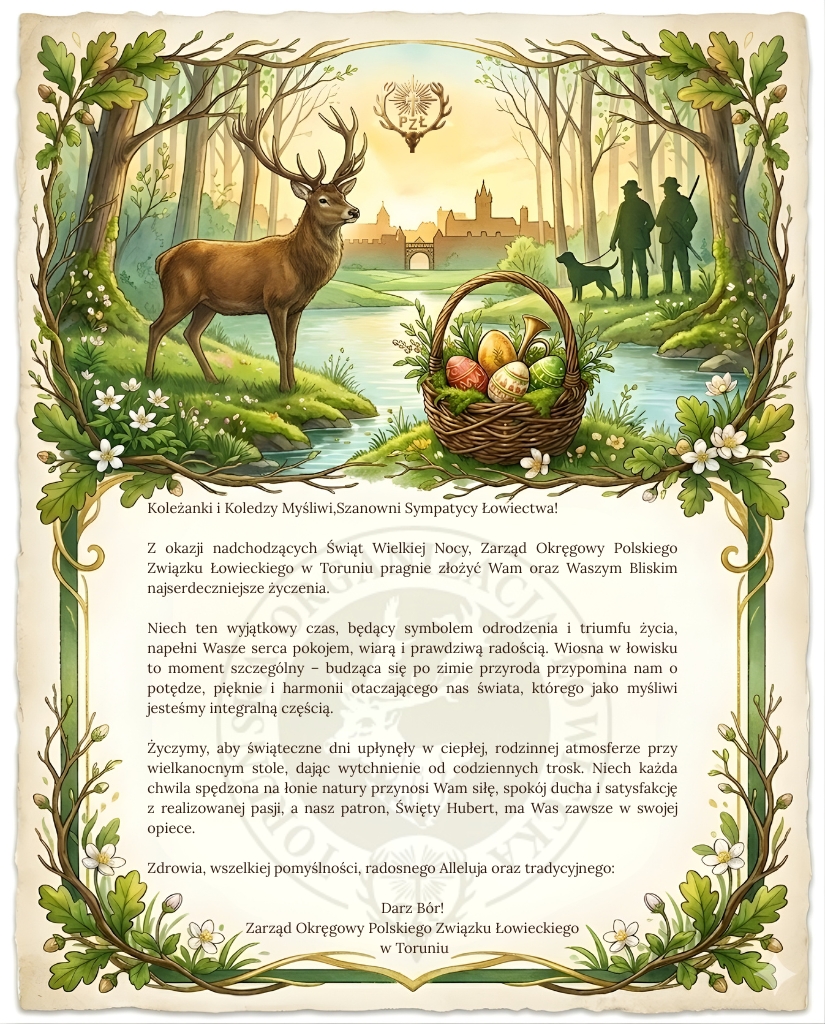 Z okazji nadchodzących Świąt Wielkiej Nocy, Zarząd Okręgowy Polskiego Związku Łowieckiego w Toruniu pragnie złożyć Wam oraz Waszym Bliskim najserdeczniejsze życzenia.